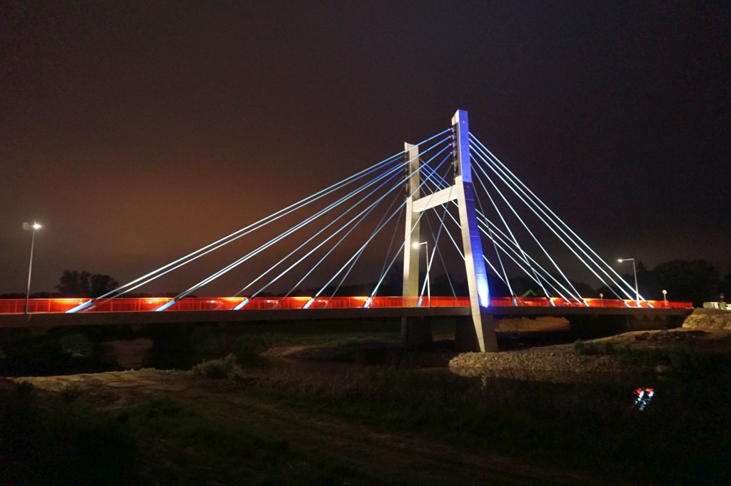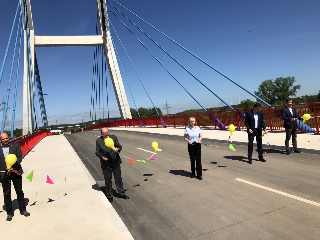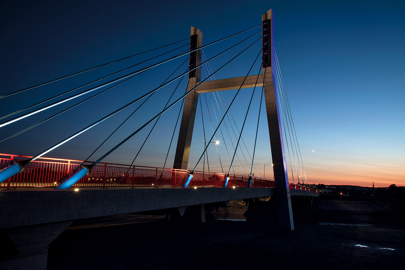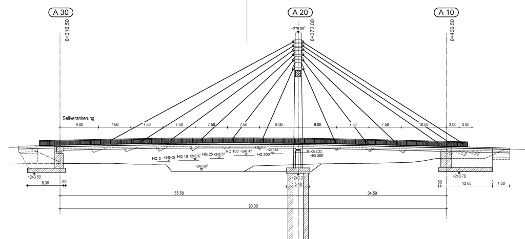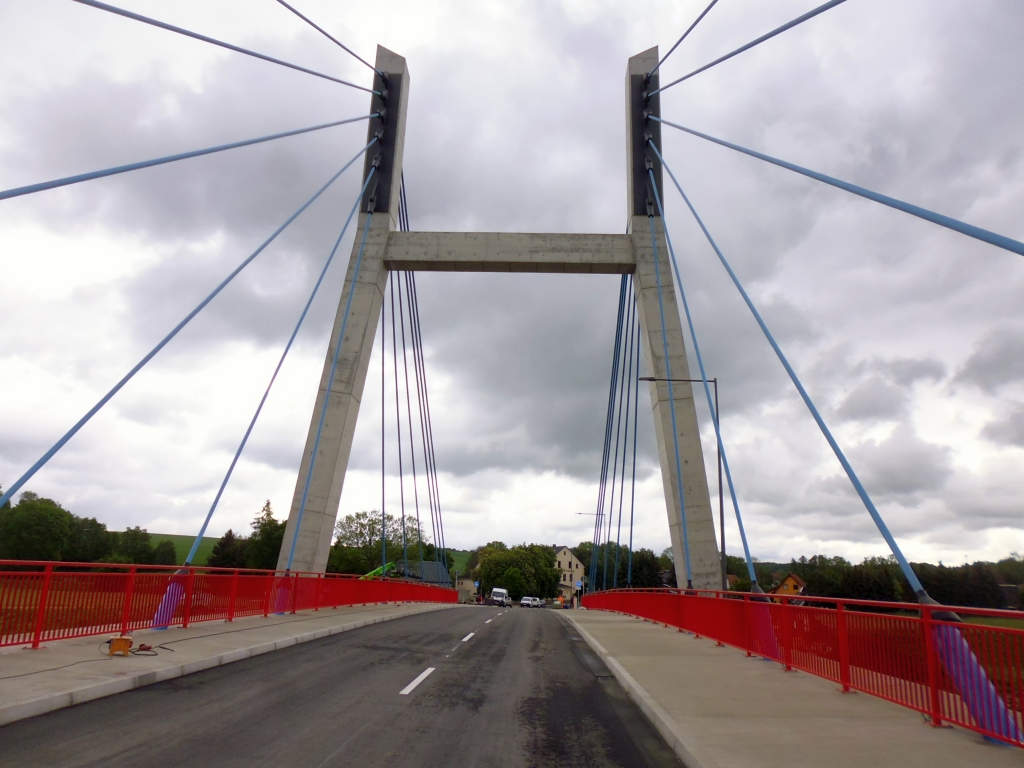 Am 23. April 2018 vollzog der Landrat Zwickauer Land, Herr Dr. Scheurer, den ersten Baggerhub für den Ersatzneubau der Muldenbrücke Schlunzig. Am 29. Mai 2p020 wurde das Bauwerk für den Verkehr freigegeben. Die Brücke im Zuge der K 9316 war durch das Hochwasser 06/2013 stark beschädigt worden. Dies war der Anlass für eine Wirtschaftlichkeits- und Machbarkeitsuntersuchung zur Schadensbeseitigung. Da das Bauwerk aus dem Jahre 1964 mit einer Einstufung in die BKL 30/30 sowie einer 95%-igen Auslastung einschließlich der starken Hochwasserschäden nicht mehr sinnvoll instandzusetzen war, ergab eine Variantenuntersuchung als wirtschaftlichste Lösung eine 2 Feld Schrägseilbrücke mit einer Gesamtlämnge von 90,00 m und einer Pylonhöhe von 30,60 m. Die Fahrbahnplatte wurde als semiintegrale Stahlbetonvollplatte ausgebildet. Der Pylon ist ebenfalls als Stahlbetonvollquerschnitt erreichtet, die Gründung erfolgte mit Ortbetongroßbohrpfählen. Bei den Brückenseilen kam mit Vollverschluss durch HDPE-Extrudierung ein innovatives Korrosionsschutzverfahren erstmalig an einer Schrägseilbrücke in Deutschland zum Einsatz (Zustimmung im Einzelfall erteilt). Zusätzlich wurden die Zufahrtsstraßen sowie die Anschlüsse an die Hochwasserschutzanlagen neu erbaut.