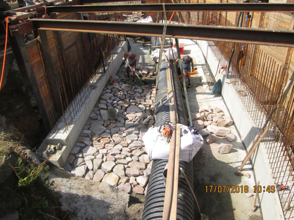 Der bauliche Zustand der vorhandenen Natursteingewölbebrücke machte einen Ersatzneubau unumgänglich. Es wurde eine flach gegründete Stahlbetonrahmenkonstruktion neu errichtet. Die erforderlichen Ausrundungsradien der Fahrbahnränder führten zu beidseitigen Aufweitungen des Überbaues. Auf den Kappen wurde eine Geh- und Notgehbahn angeordnet, zur Absturzsicherungwurden Füllstabgeländer montiert. Die Bachsohle wurde mit Wasserbausteinen in Betonbettung befestigt, die Zwischenräume mit Füllmaterial bedeckt und die Niedrigwasserrinne zur Ablagerung vonnatürlichem Sohlsubstrat tiefer ausgebildet. Als Übergang zum vorhandenen Bachlauf wurde eine Steinschüttung eingebracht.