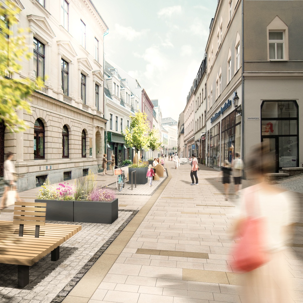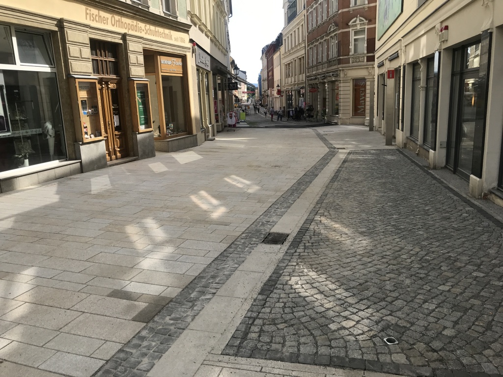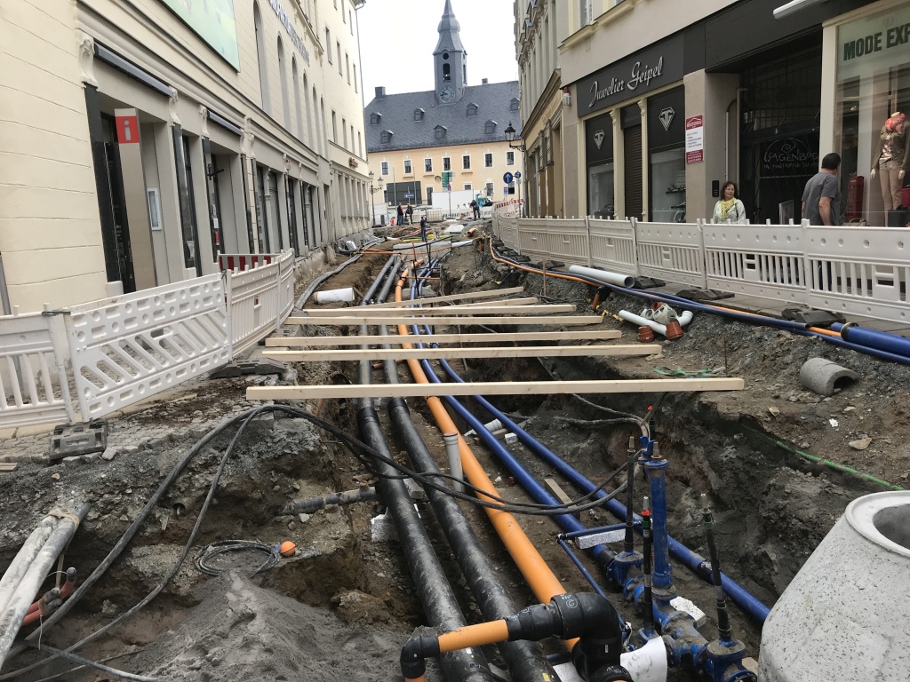 Durch die Stadt Annaberg-Buchholz erfolgt der grundhafte Ausbau der wichtigsten Einkaufsstraße der Stadt. Es handelt sich bei der Maßnahme um eine Fußgängerzone im denkmalgeschützten Altstadtbereich, die auf 365 m Länge mit sehr hohen Anforderungen an die Gestaltung und die Barrierefreiheit komplett erneuert wird. Zusätzlich sind eine Platzgestaltung sowie der Neubau von Stützwänden erforderlich. Es handelt sich um ein sehr kleinteiliges Bauvorhaben über mehrere Jahresscheiben. Bei der Umsetzung müssen der Weiterbetrieb und die Anlieferung von ca. 50 Geschäften berücksichtigt werden. Neben dem Oberbau erfolgt die komplexe Erneuerung des gesamten Leitungsbestandes als koordinierte Gemeinschaftsmaßnahme.